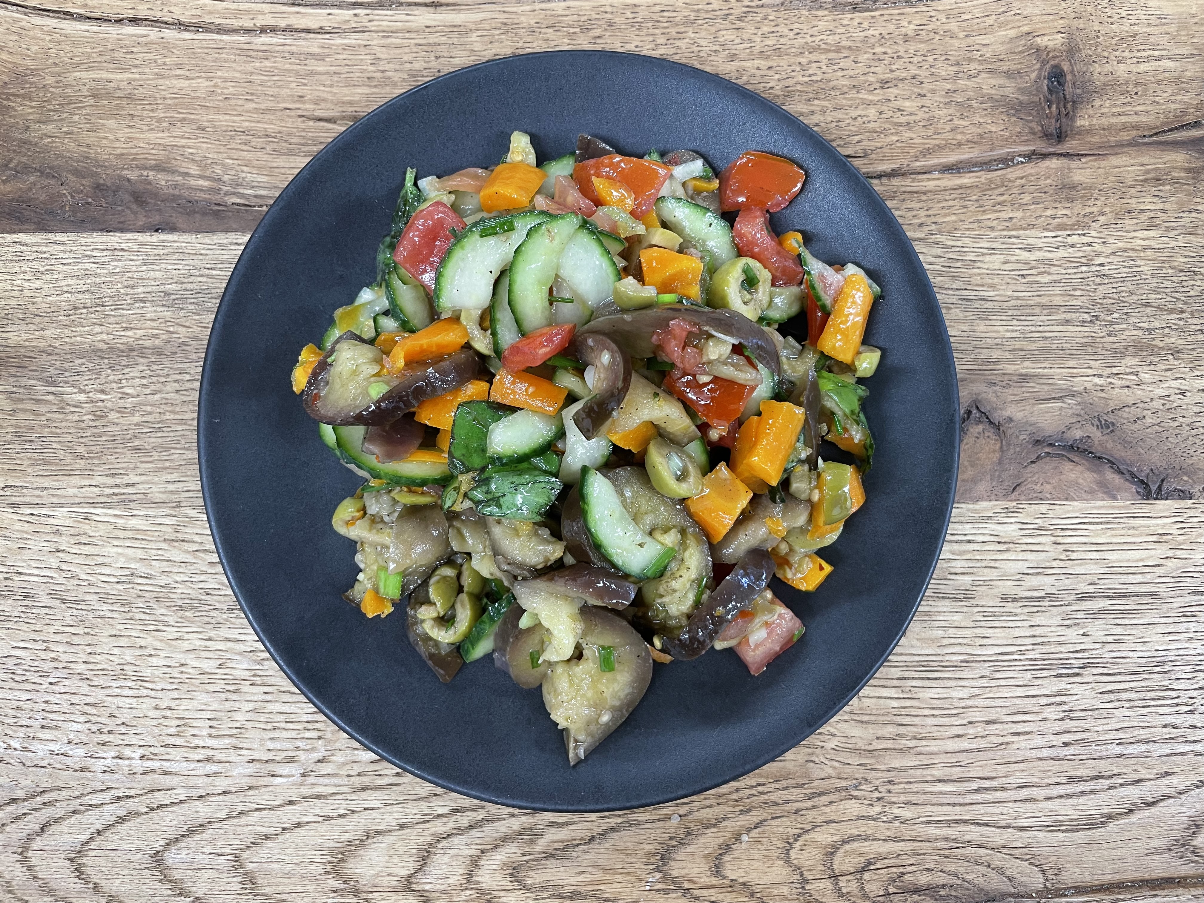gebackene Rüebli, Gurke, Tomate, Frühlingszwiebeln, Oliven, Chiliflocken, Kräuter-Zitronen-Vinaigrette